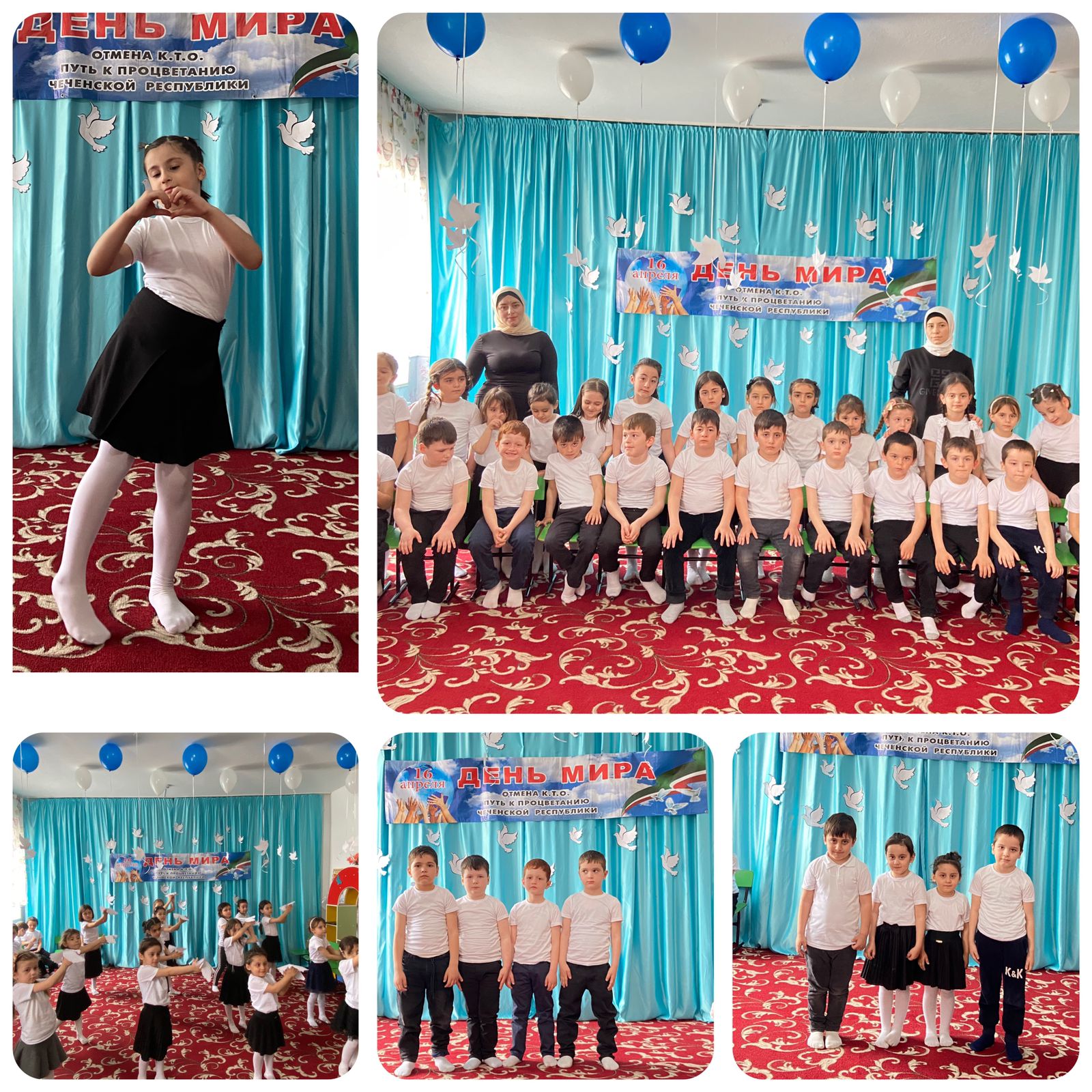 Фасады здания тематически оформлены, проведены тематические беседы во всех группах на тему: «Как появился этот праздник и почему его празднуют в Чеченской республике», занятие по ИЗО- рисование «Голубь символ мира» в средней группе «Ангелочки», занятие по ИЗО- рисование, а так же был проведен утренник «Мы за мир на всей планете» в старшей группе «Солнышко».